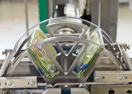 - Die liegend von der Vormaschine zugeführten Beutel werden entsprechend den Vorgaben ausgerichtet und an der Spendekante direkt in den vorbereiteten Tray gespendet.