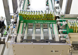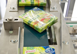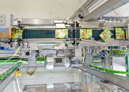 - In der hier dargestellten Applikation wird der Tray zentral für die gesamte Produktion mit dem Trayaufrichter ATA aufgerichtet und über Bänder dem Horizontalpacker AHP zugeführt. Die Maschine AHP kann aber, als Kombinationsmaschine, auch mit einem integrierten Trayaufrichter ausgerüstet werden.